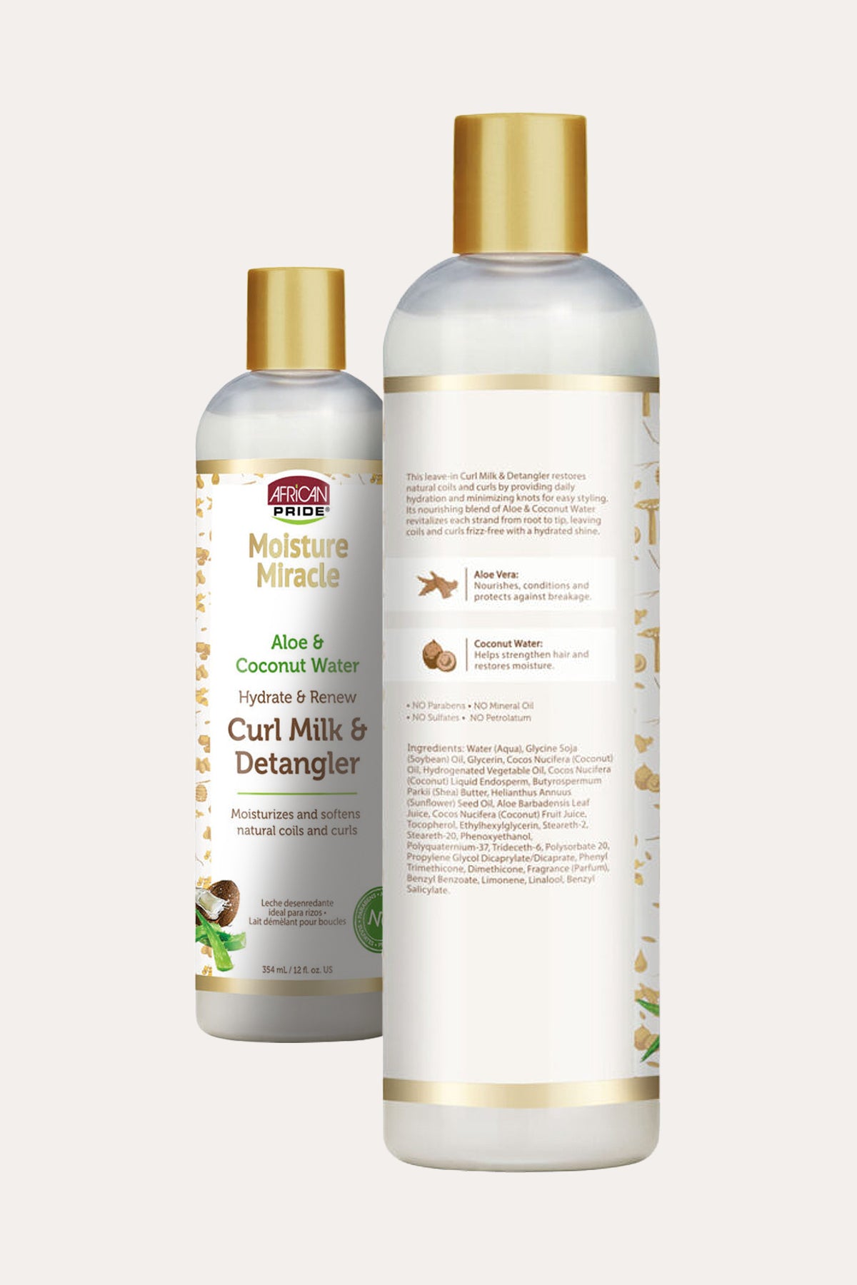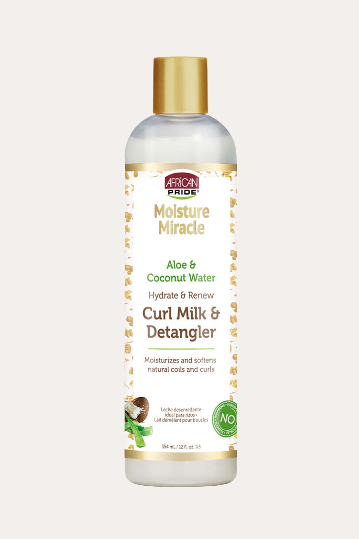 frican Pride Moisture Miracle Curl Milk Detangler is a lightweight leave-in milk that hydrates, softens, and helps detangle curls and coils with ease. Infused with Aloe Vera and Coconut Water, this daily moisturizer restores moisture, reduces knots, and leaves hair smooth, shiny, and frizz-free.