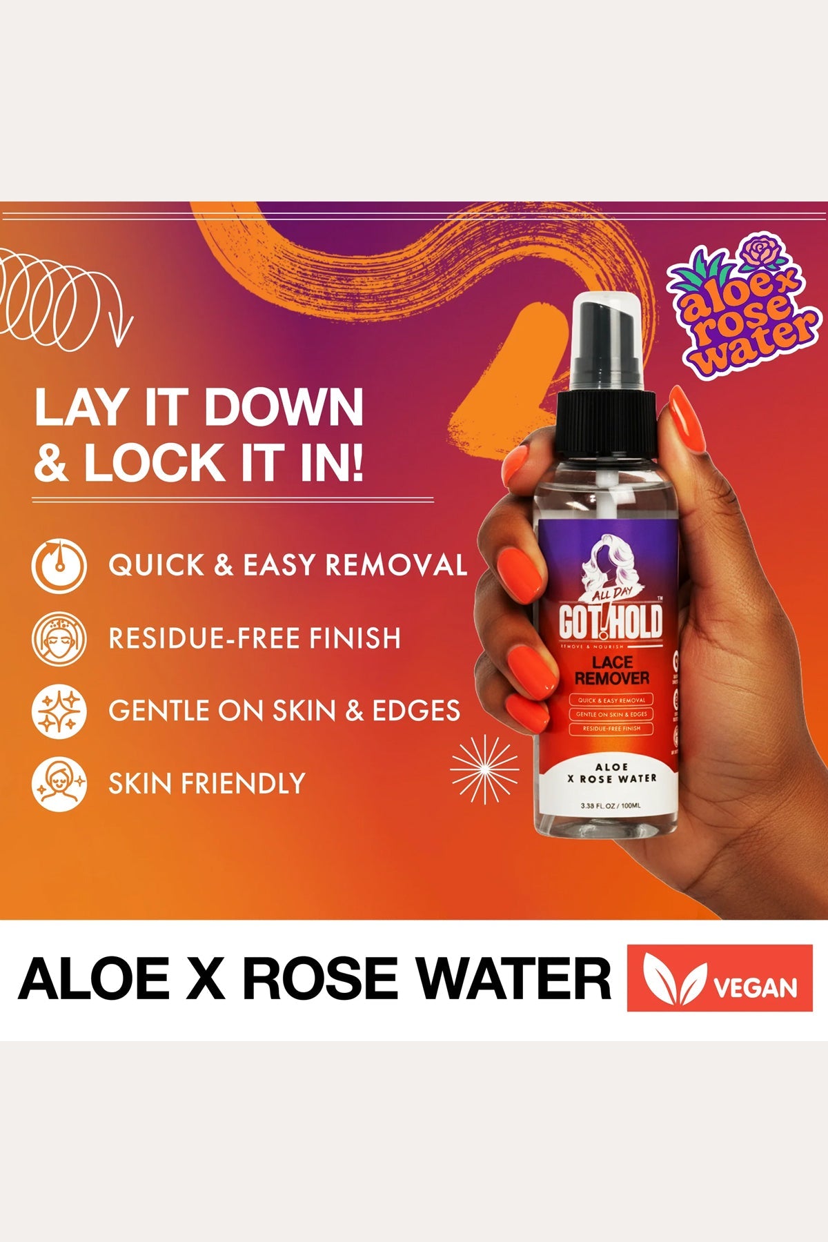 ALL DAY GOT HOLD Lace Remover is a gentle yet fast-acting lace adhesive remover designed to take down wig installs safely and comfortably. The lightweight formula dissolves adhesive buildup with ease—no harsh rubbing, pulling, or irritation—helping protect both your hairline and scalp during removal.