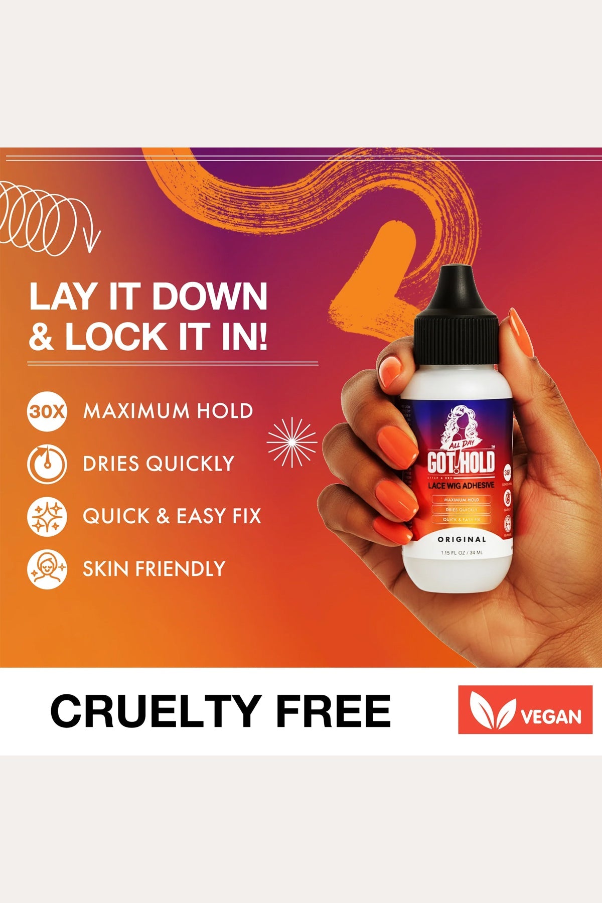 ALL DAY GOT HOLD Lace Wig Adhesive glue is a professional-grade lace glue designed to deliver strong, long-lasting hold with a clean, natural finish. Its lightweight, fast-drying formula blends seamlessly into the skin, keeping lace installs smooth, secure, and virtually undetectable throughout the day.