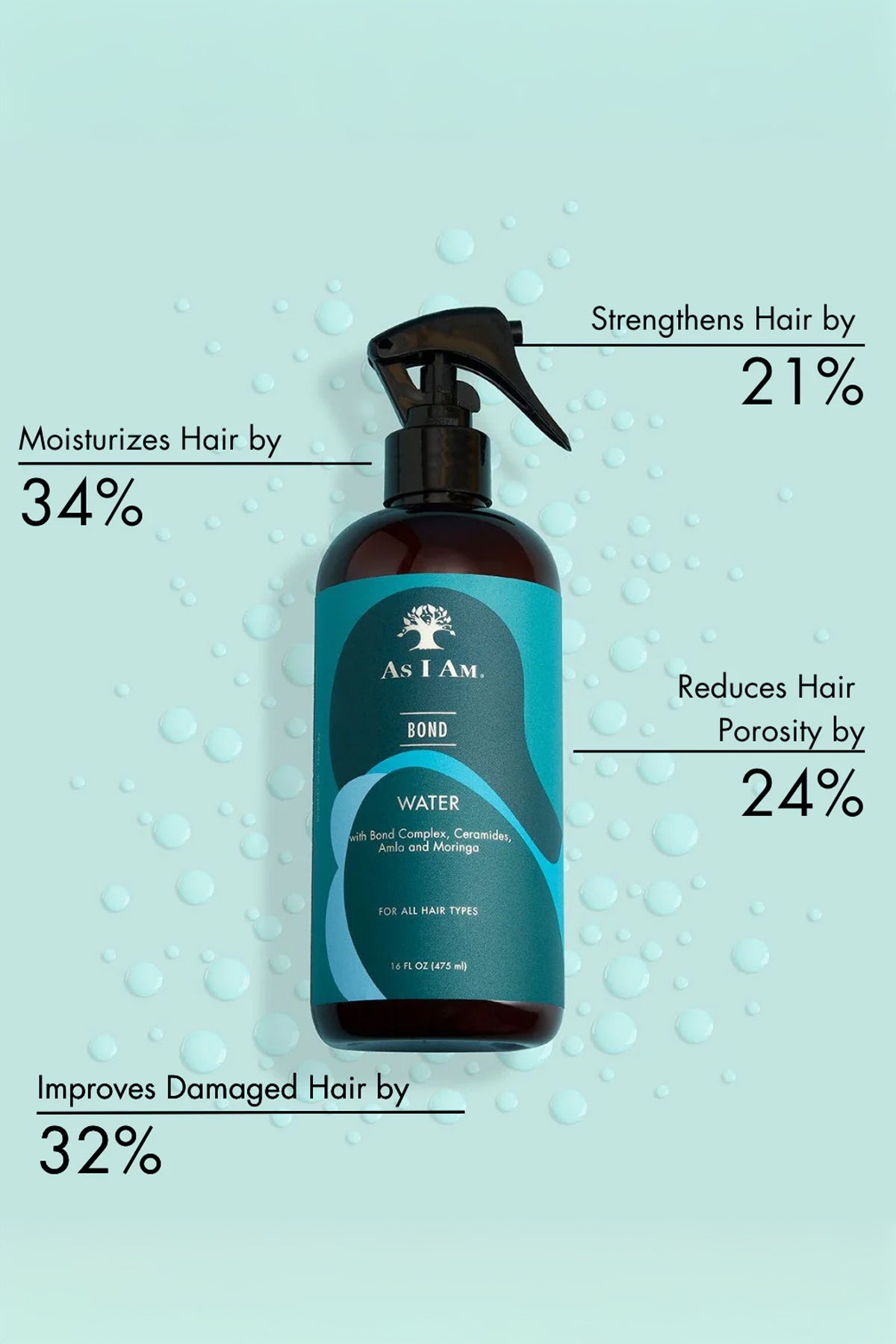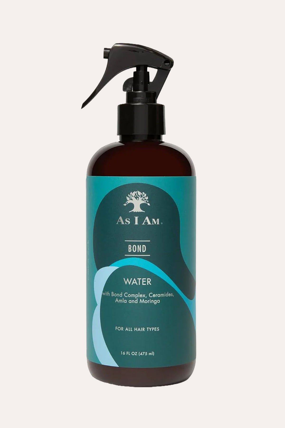AS I AM Bond Water is a lightweight, bond-supporting leave-in hydration mist designed to strengthen, hydrate, and refresh damaged hair. This ultra-fine mist delivers instant moisture while helping reinforce the hair’s internal bonds, improving softness, manageability, and overall resilience.