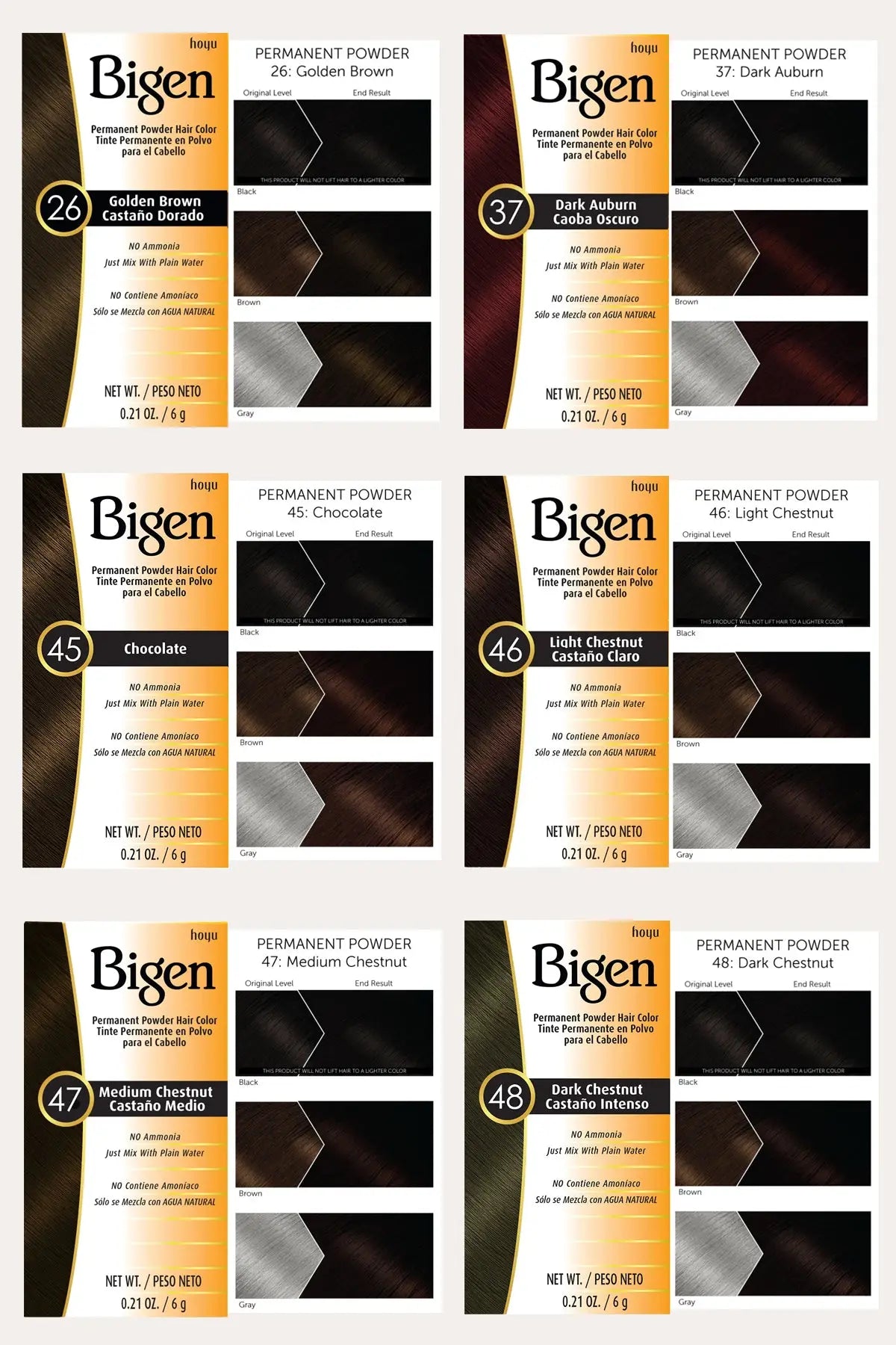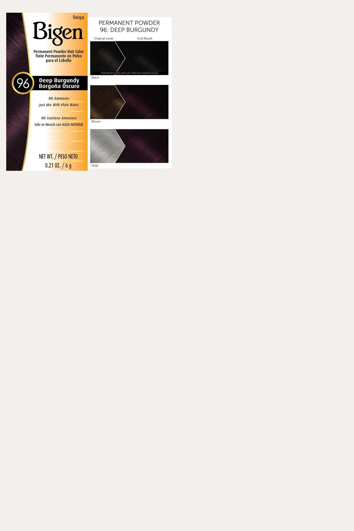 Bigen Permanent Powder is a deposit-only hair color which does not require lifting (lightening) action to darken hair. While some ordinary permanent hair colors unnecessarily utilize both actions, Bigen's simple coloring system means less damage to your hair. Bigen Permanent Powder Hair Color leaves your hair looking smooth, natural-looking and shiny.