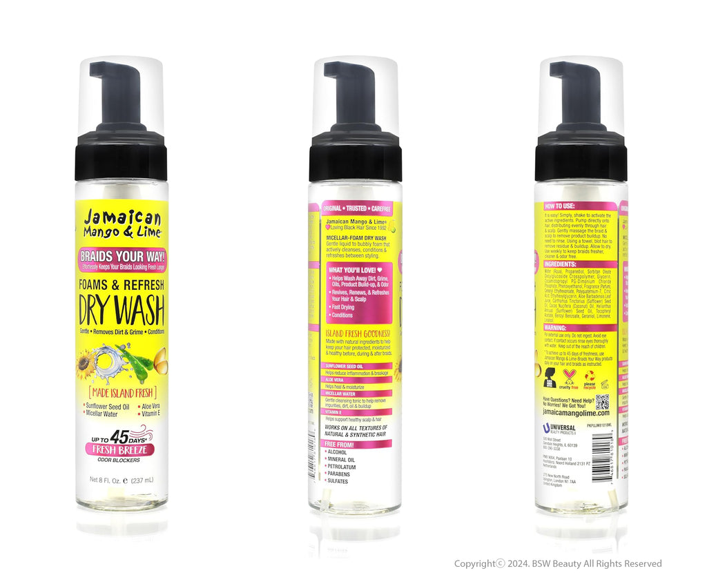 Revitalize your braids in an instant with Jamaican Mango & Lime's Braids Your Way Foams & Refresh Dry Wash. This innovative formula refreshes and restores your braids, eliminating dullness and promoting vibrant, fresh-looking hair without the need for water. Perfect for on-the-go braid care, it provides an effortless way to maintain your braids with just a few spritzes.