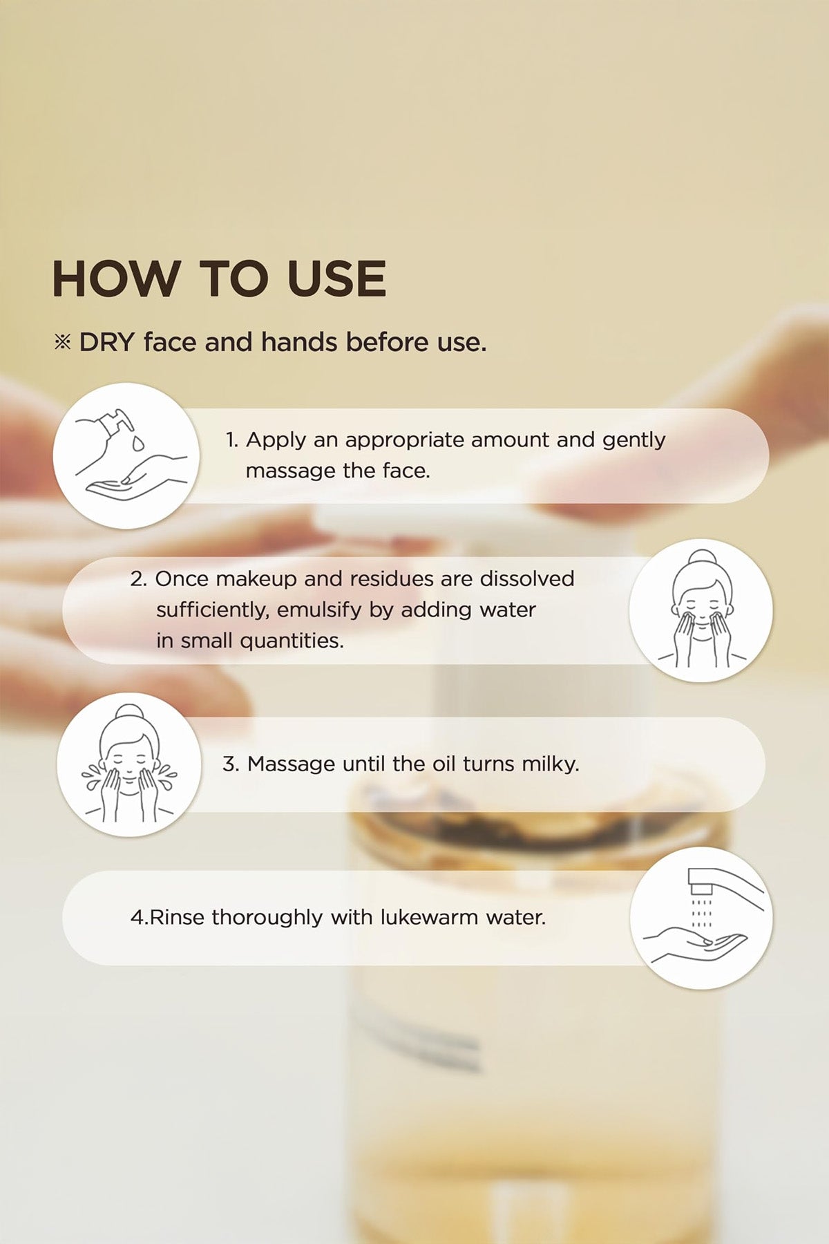 Apply 2–3 pumps to dry hands and gently massage onto dry face to dissolve makeup and impurities.